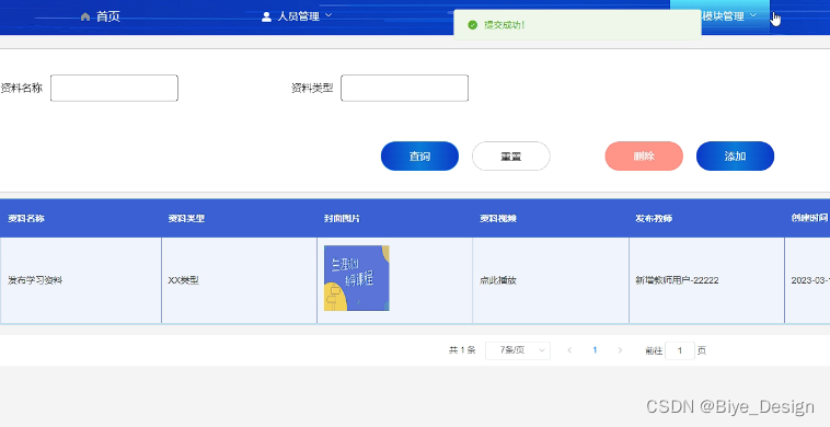 | 进入学习资料管理界面,点击某条数据后面的删除按钮 | 提示“是否要删除该数据”,如果用户点击“确定”按钮,则成功删除该条数据,并提示“删除成功”,之后返回查询界面 | 一致 | |