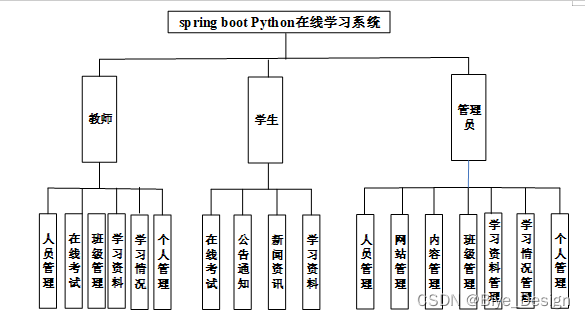 在线学习系统在对需求做解析后,整个系统主要分为三个部分:管理员和教师,学生用户,每个模块下的分支功能不一样。对功能做出如下说明: