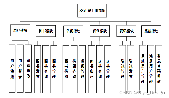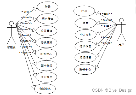 根据用户对系统的需求,要求系统简单操作,能够准确,完整的对信息进行管理。线上图书馆系统在对需求做解析后,整个系统主要分为两个部分:管理员和普通用户,每个模块下的分支功能不一样。对功能做出如下说明: