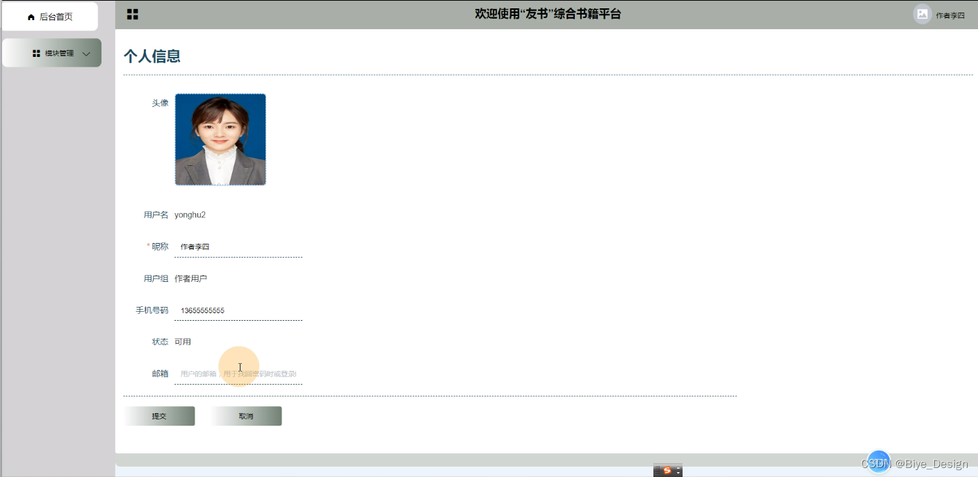 个人中心,在个人中心页面中通过填写作者用户名、密码、昵称、性别、手机、邮箱、用户类型等信息进行修改操作,如图5-11所示。