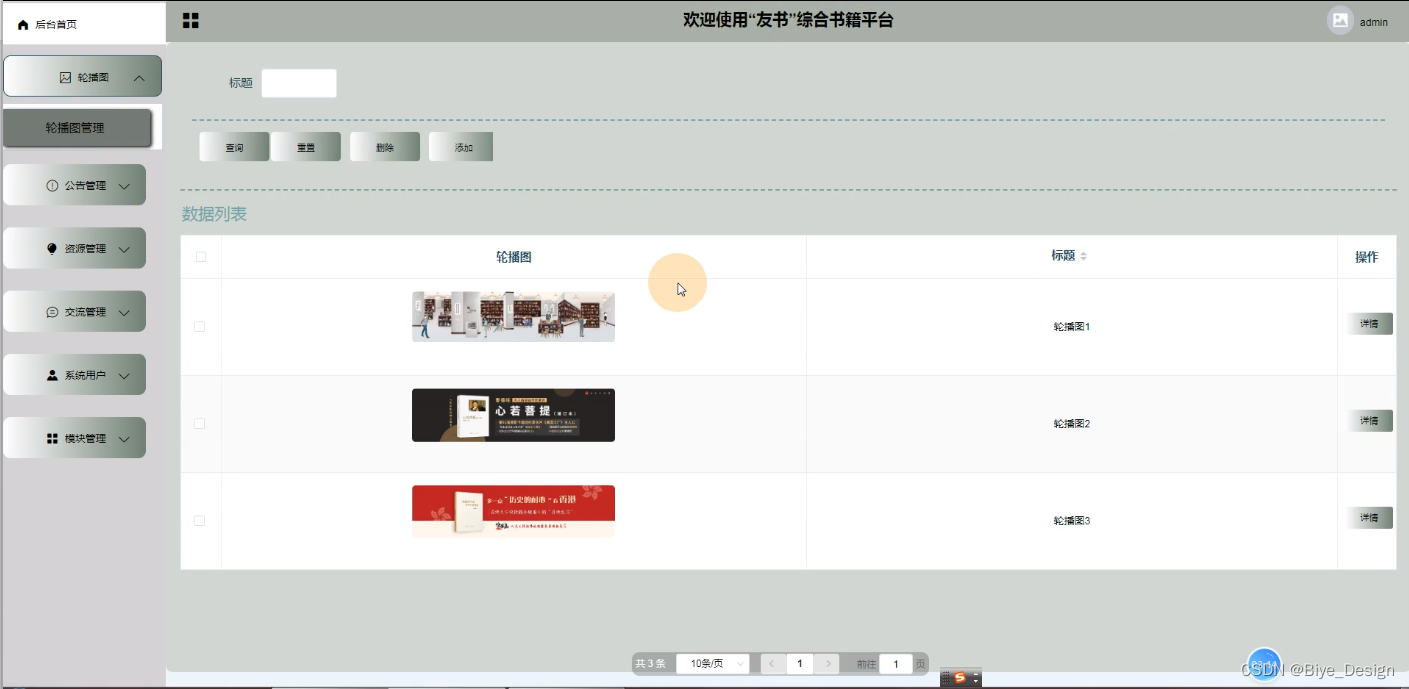 轮播图管理,在轮播图管理页面中可以对索引、轮播图、标题等信息进行详情,修改或删除等操作,如图5-9所示。