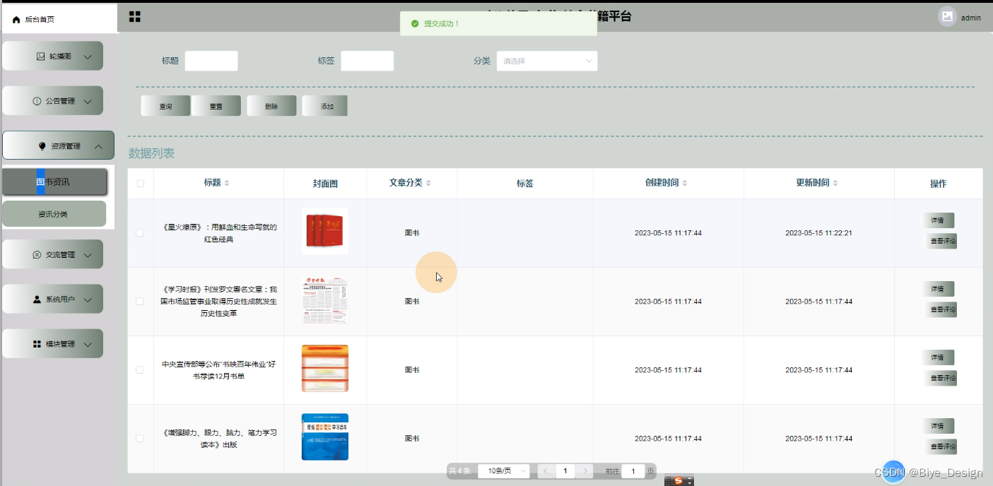 3、功能的完善性:可以管理首页、轮播图(轮播图管理)、公告管理(公告)、资源管理(图书资讯、资讯分类)、交流管理(读书分享、读书分享分类)、系统用户(管理员、读者用户、作者用户)、模块管理(书籍分类、图书信息、购书记录、发货记录、博客中心)模块的修改维护操作。