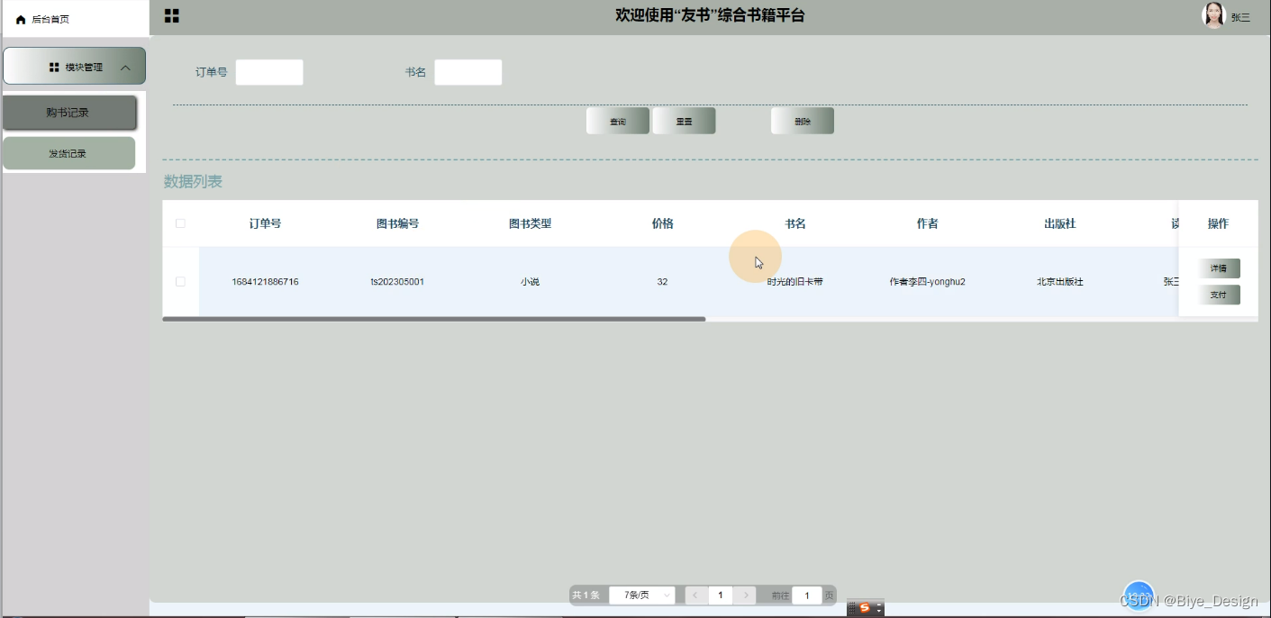 购书记录,在购书记录页面中可以对索引、订单号、图书编号、图书类型、价格、书名、作者、出版社等信息进行详情支付、修改或删除等其他详细操作,如图5-15所示。