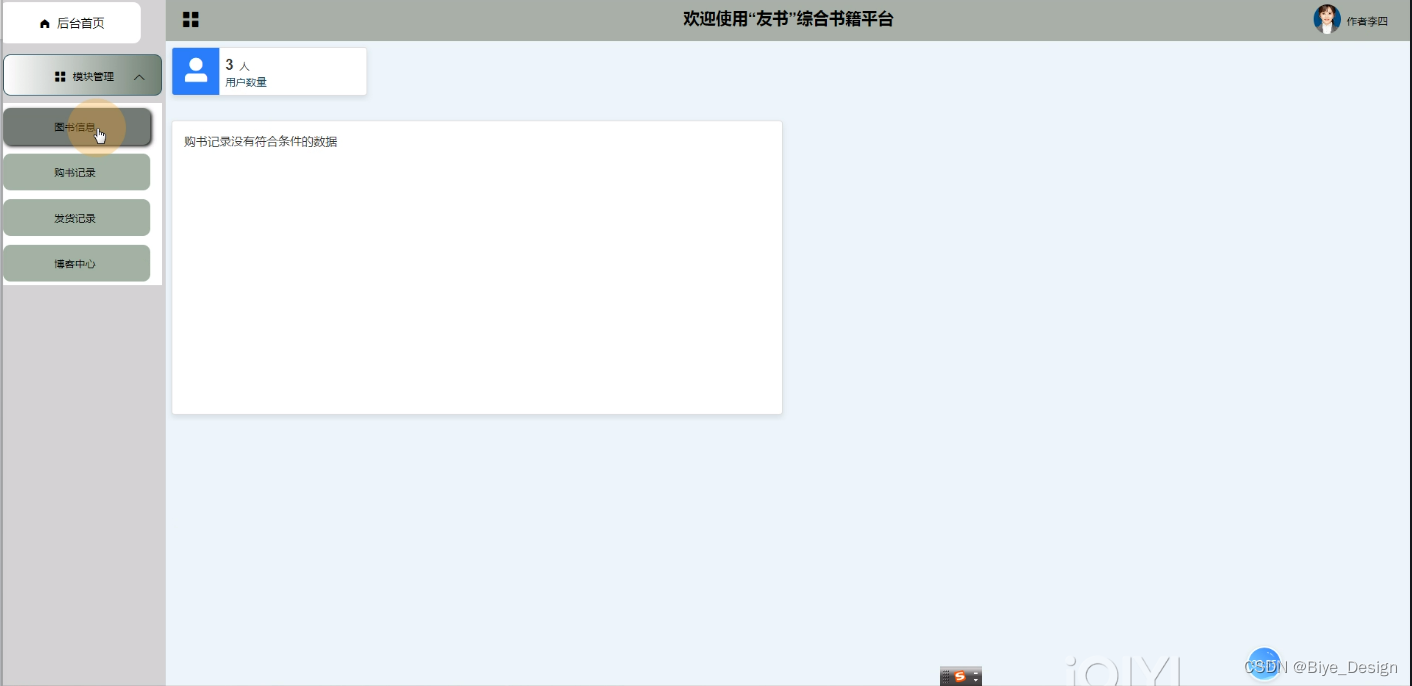 作者用户登录进入平台可以查看首页、模块管理(图书信息、购书记录、发货记录、博客中心)、个人中心等内容进行详细操作,如图5-10所示。