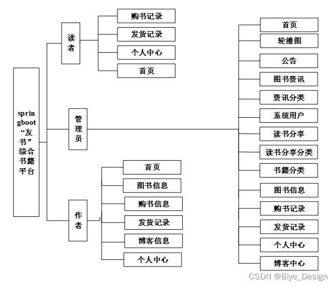 (1)功能要求:可以管理首页、轮播图(轮播图管理)、公告管理(公告)、资源管理(图书资讯、资讯分类)、交流管理(读书分享、读书分享分类)、系统用户(管理员、读者用户、作者用户)、模块管理(书籍分类、图书信息、购书记录、发货记录、博客中心)等功能模块。