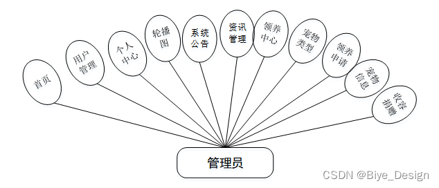 系统中的核心用户是系统管理员,管理员登录后,通过管理员来管理后台系统。主要功能有:首页、个人资料、公共管理(轮播图、系统公告)用户管理(管理员、领养用户)信息管理(宠物资讯、资讯分类)领养中心、宠物类型、领养申请、宠物信息、收容捐赠等功能。管理员用例如图3-7所示。