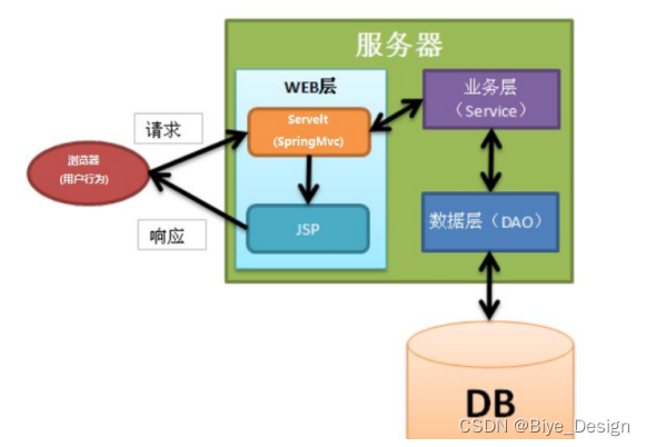 页面发送请求给控制器,控制器调用业务层处理逻辑,逻辑层向持久层发送请求,持久层与数据库交互,后将结果返回给业务层,业务层将处理逻辑发送给控制器,控制器再调用视图展现数据。
