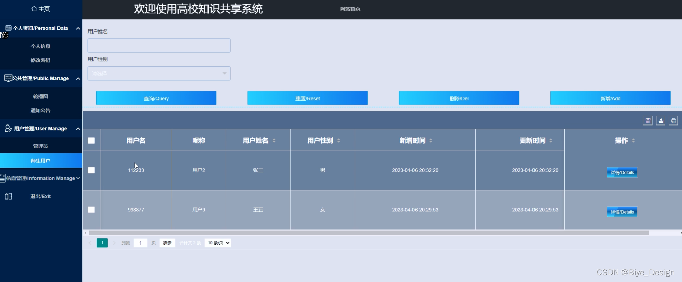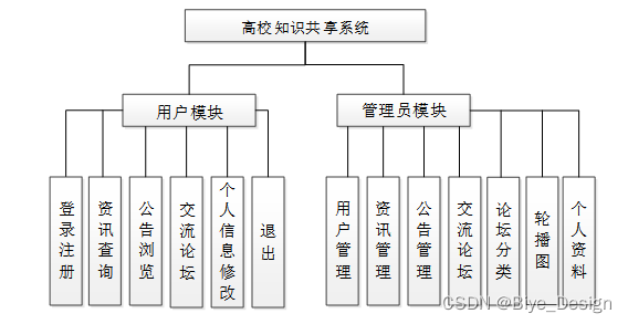 (3)确定好系统使用的技术,进行在线确认系统所划分的用户触,并且根据用户触划分确定所要设计的功能模块,对高校知识共享系统的设计主要划分别为管理员和用户触,并所使用的功能模块也相应不同,但系统的数据库实现的内容是交互的,驴可以随时根据自己的需求进行信息搜索,对于系统工作人员可以根据自己的分管内容进行在线信息的处理及操作,管理员获取到所有用户的详细数据信息,并根据需求进行第一时间处理解决。