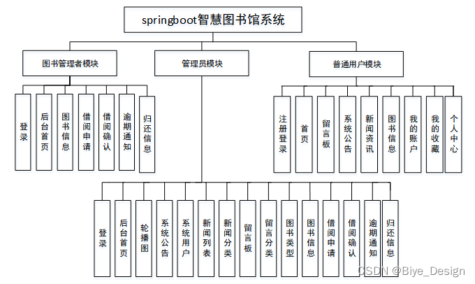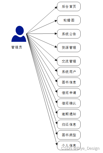 管理员模块:后台首页、轮播图、系统公告管理、资源管理(新闻列表、新闻分类)、交流管理(留言板、留言分类)、系统用户管理(管理员、图书管理者、普通用户)、模块管理(图书类型、图书信息、借阅申请、借阅确认、逾期通知、归还信息)。