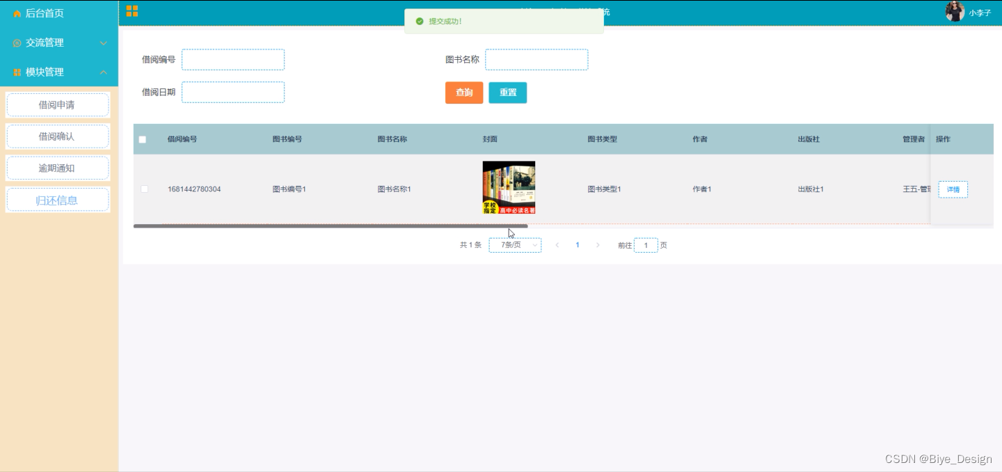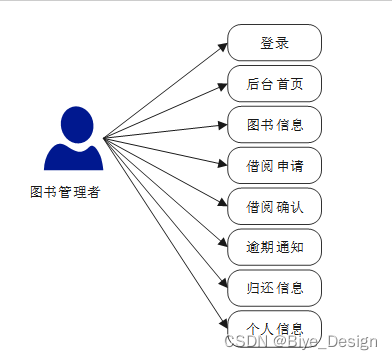 图书管理者:后台首页、模块管理(图书信息、借阅申请、借阅确认、逾期通知、归还信息)
