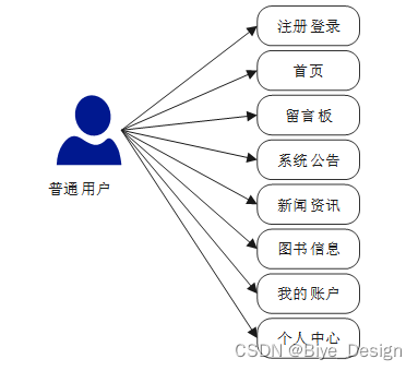 根据用户对系统的需求,要求系统简单操作,能够准确,完整的对信息进行管理。智慧图书馆系统在对需求做解析后,整个系统主要分为三个部分:管理员、图书管理者和普通用户,每个模块下的分支功能不一样。对功能做出如下说明: