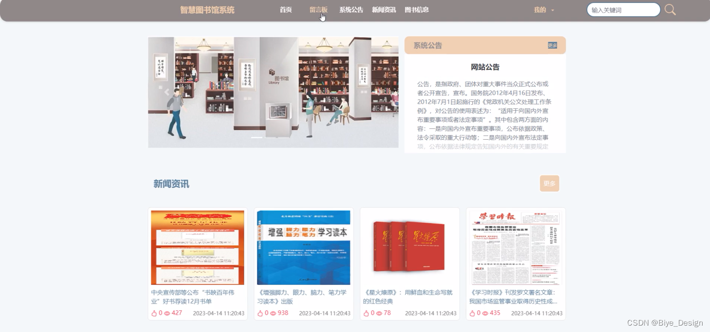 用户模块:首页、留言板、系统公告、新闻资讯、图书信息、我的账户、我的收藏、个人中心等。
