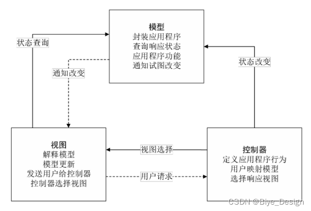 MVVM 就是将其中的View 的状态和行为抽象化,让我们将视图 UI 和业务逻辑分开。当然这些事 ViewModel 已经帮我们做了,它可以取出 Model 的数据同时帮忙处理 View 中由于需要展示内容而涉及的业务逻辑。它强制性的把应用程序的输入、输出和处理全部分开,将其分为三个核心部分,这三个部分分别有不同的功能。