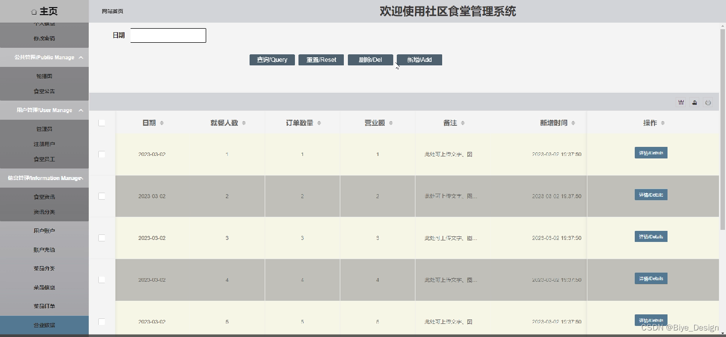 营业数据管理:存储食堂营业等详情数据项。