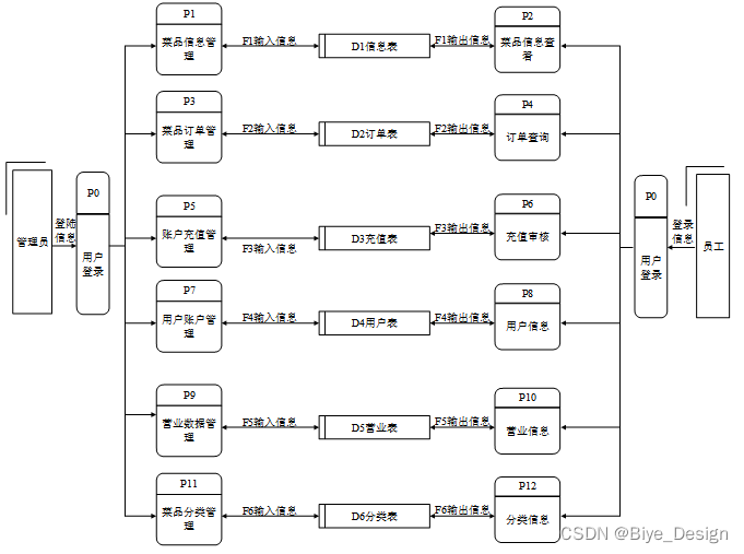对系统的数据流进行分析,系统的使用者分为二类,一般用户(食堂员工、普通用户),管理员。系统主要对界面信息传送,登录信息的验证,注册信息的接收,用户各种操作的响应做处理。