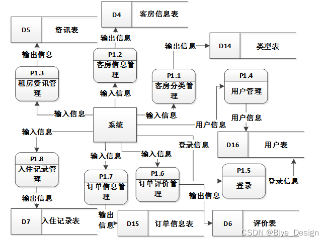 二层数据流程是对一层数据流层图中填写登录注册信息、用户功能的细化。即:填写登录注册信息细化为填制信息、后台审核,用户功能细化为浏览租房资讯、客房信息、入住信息等操作。