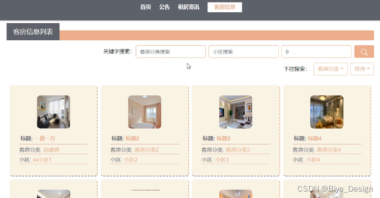客房信息:用户可以关键字搜索房屋信息,房屋分类,点击进去可以查看房屋信息详情。