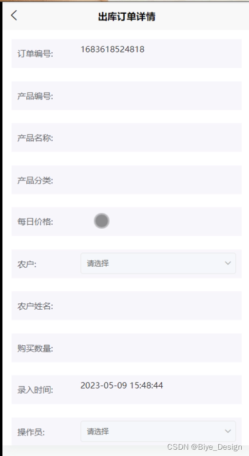 出库订单详情,农户可以在出库订单详情页面中填写、提价订单编号、产品编号、产品名称、产品分类、每日价格、农户、农户姓名、购买数量、录入时间、操作员等信息,如图5-12所示。