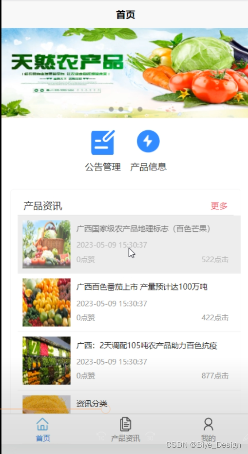 首页,农户登录小程序后可以查看在仓储管理页面中查看首页、公告管理、产品信息、产品资讯、我的(基本信息、收藏、入库订单、出库订单)等功能模块,并进行相对应操作,如图5-10所示。