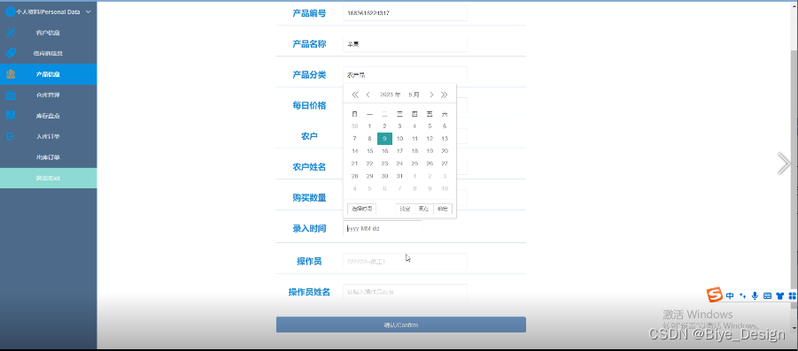 购买,在产品信息页面可以点击购买操作,可录入产品编号、产品名称、产品分类、每日价格、农户、农户姓名、购买数量、录入时间、操作员、操作员姓名等信息,如图5-9所示。
