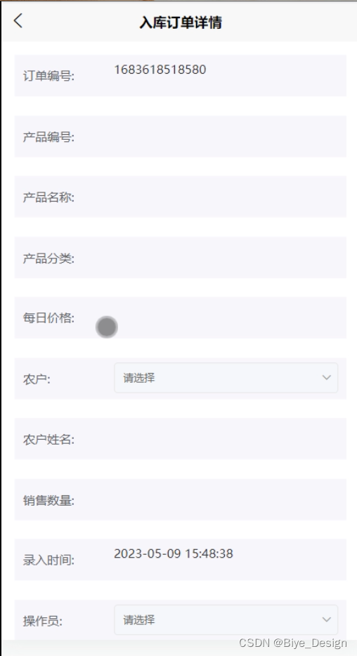 入库订单详情,农户可以在入库订单详情页面中填写、提价订单编号、产品编号、产品名称、产品分类、每日价格、农户、农户姓名、销售数量、录入时间、操作员等信息,如图5-13所示。