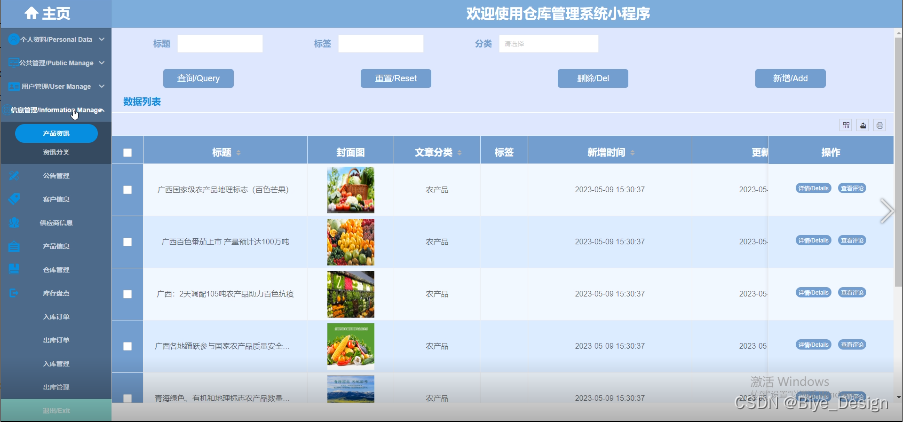 (1)功能要求:可以管理首页、个人资料(个人信息、修改密码)、轮播图管理、用户管理(管理员、农户、员工)、信息管理(产品资讯、资讯分类)、公告管理、客户信息、供应商信息、产品信息、仓库管理、库存盘点、入库订单、出库订单、入库管理、出库管理等功能模块。
