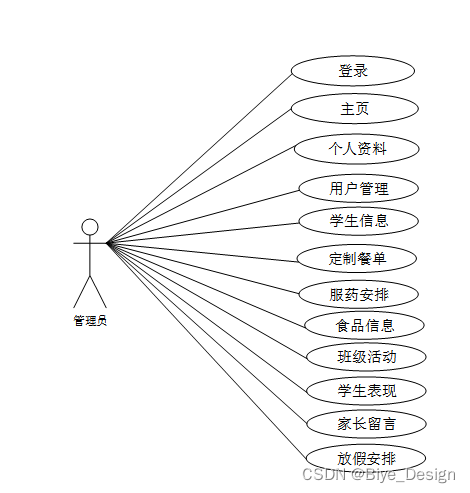 管理员所能使用的功能主要有:主页、个人资料(个人信息、修改密码)、用户管理(管理员、家长用户、教师用户、厨师用户、校医用户)、学生信息、定制餐单、服药安排、食品信息、班级活动、学生表现、家长留言、放假安排等功能模块。