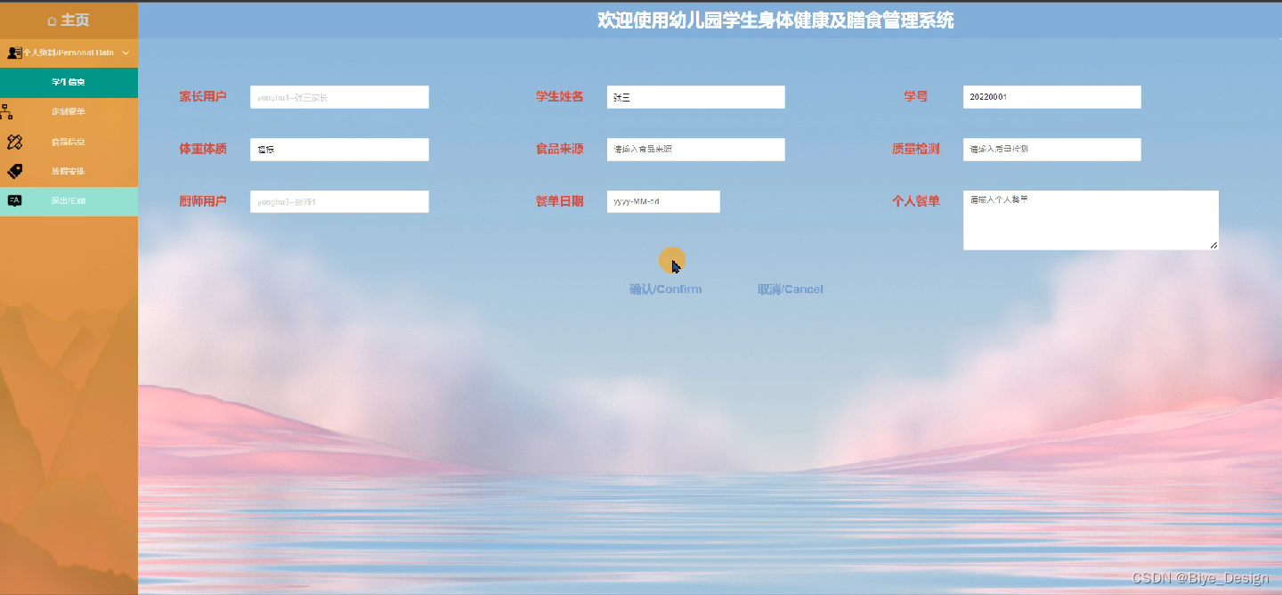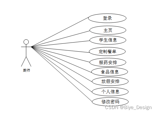 厨师用户可以实现主页、个人资料(个人信息、修改密码)、学生信息、定制餐单、食品信息、放假安排等功能模块。