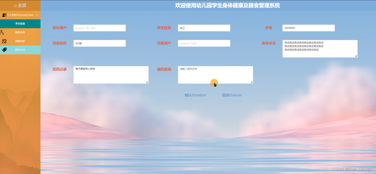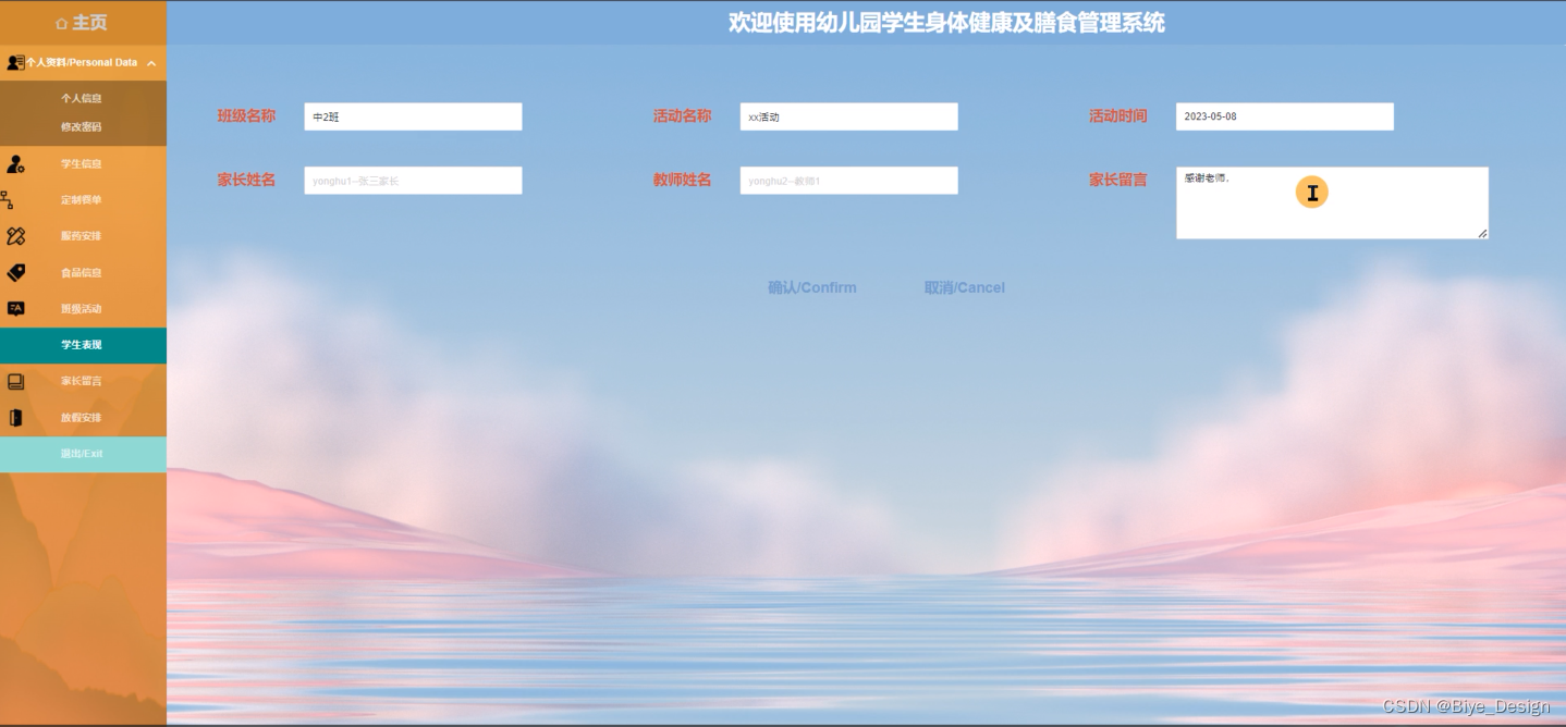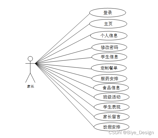 家长用户可以实现主页、个人资料(个人信息、修改密码)、学生信息、定制餐单、服药安排、食品信息、班级活动、学生表现、家长留言、放假安排等功能模块。