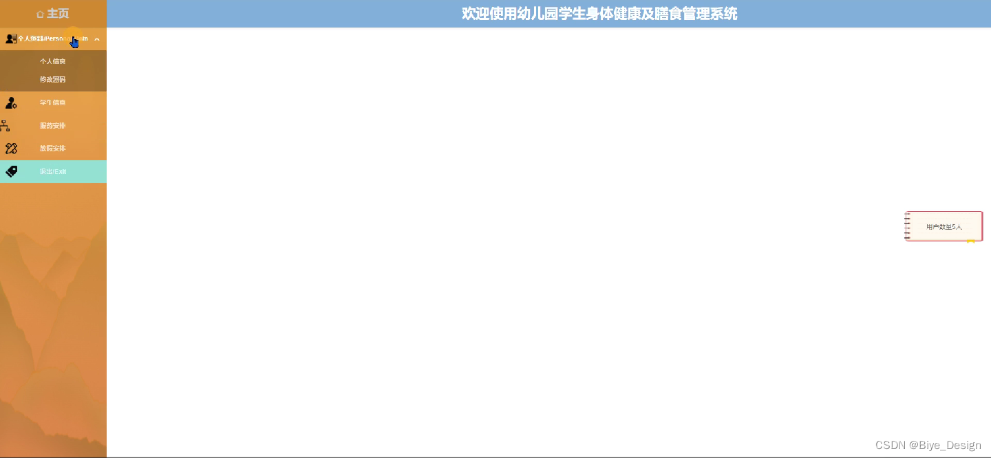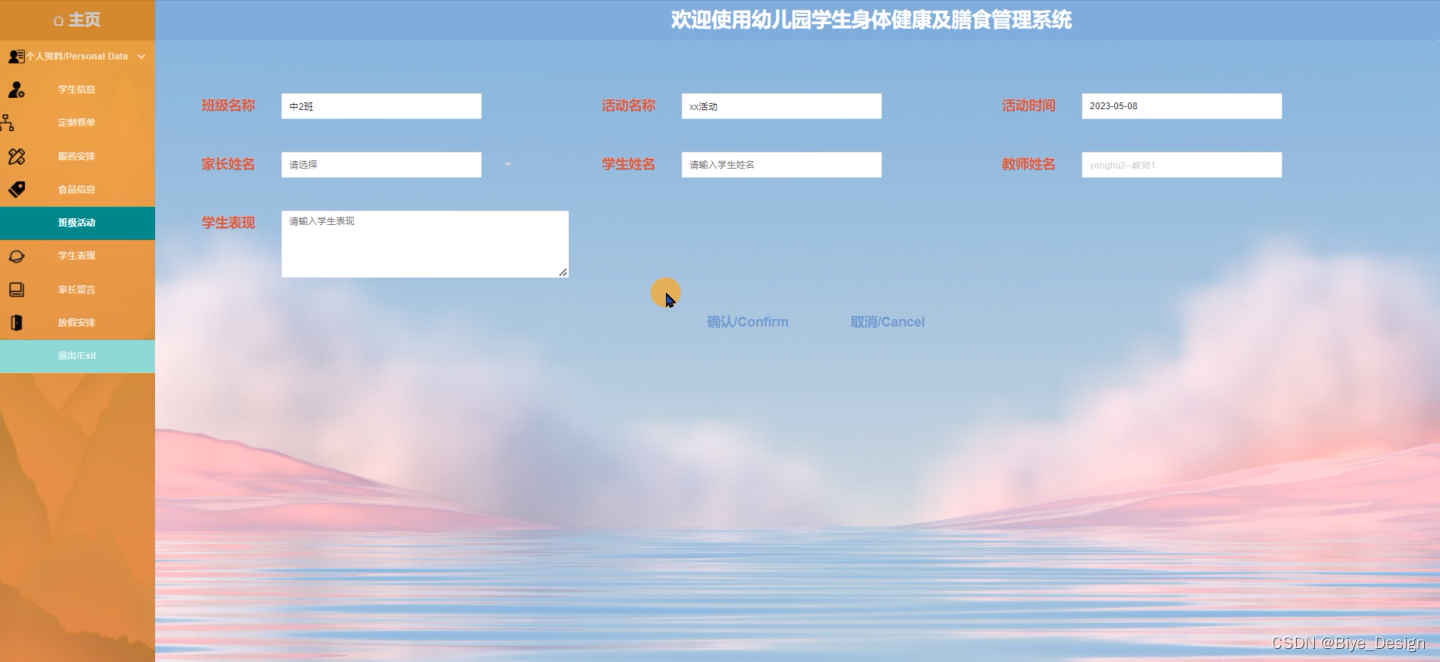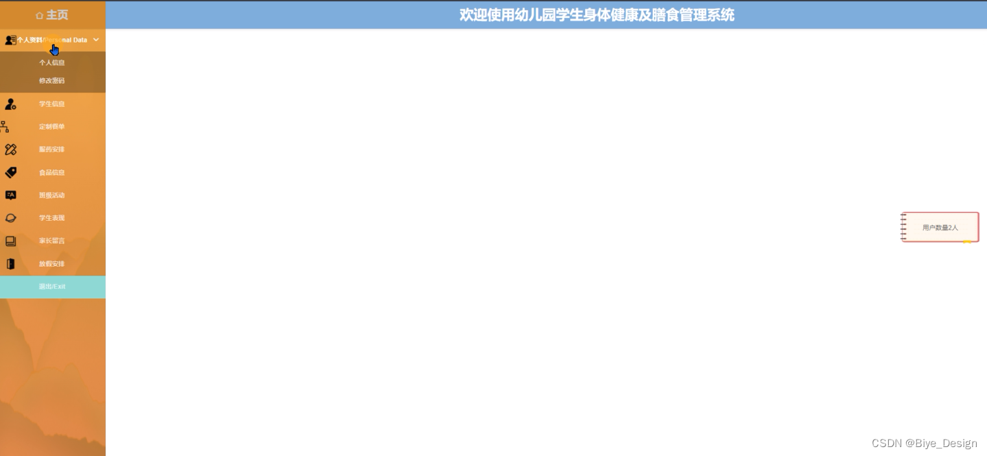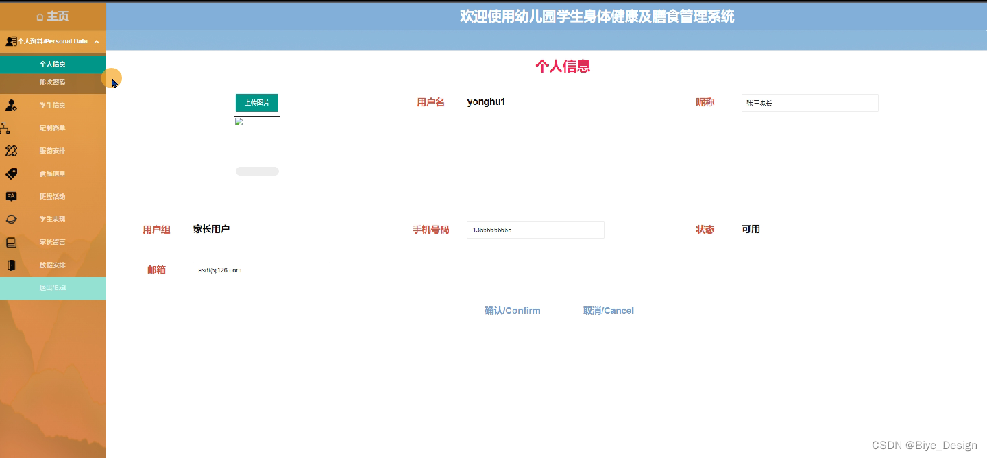 幼儿园学生身体健康及膳食管理系统的后台中,管理员对用户在前台提交申请产生的数据进行处理,以满足用户的需求。前台系统和后台系统有数据交互,整个系统各个部分相互独立又密不可分。后台的功能主要包括后台:主页、个人资料、用户管理、学生信息、定制餐单、服药安排、食品信息、班级活动、学生表现、家长留言、放假安排等功能模块。