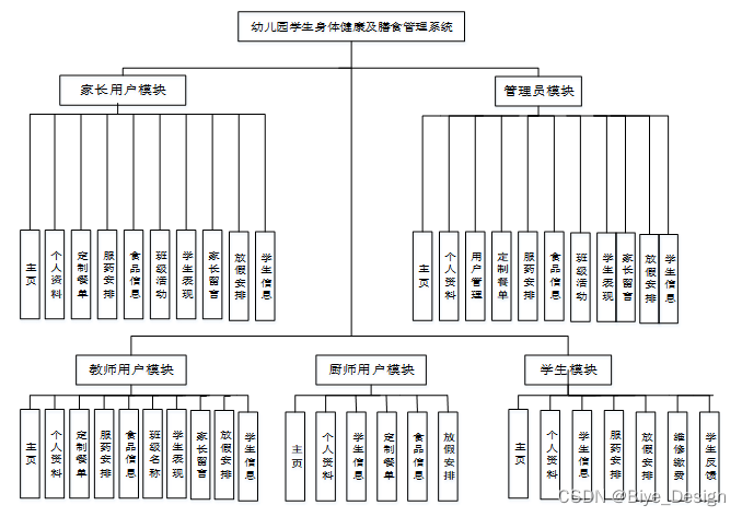 (3)确定好系统使用的技术,进行在线确认系统所划分的用户角色,并且根据用户角色划分确定所要设计的功能模块,对于幼儿园学生身体健康及膳食管理系统的设计主要划分别为管理员、家长用户、教师用户、厨师用户和校医用户角色,并所使用的功能模块也相应不同,但是系统的数据库实现的内容是交互的,用户可以随时根据自己的需求进行信息搜索,对于系统工作人员可以根据自己的分管内容进行在线信息的处理及操作,管理员获取到所有用户的详细数据信息,并根据需求进行第一时间处理解决。