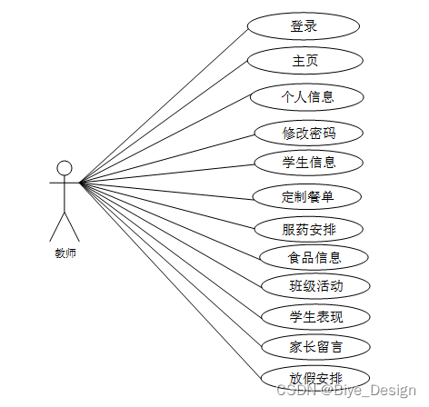教师用户可以实现主页、个人资料(个人信息、修改密码)、学生信息、定制餐单、服药安排、食品信息、班级活动、学生表现、家长留言、放假安排等功能模块。
