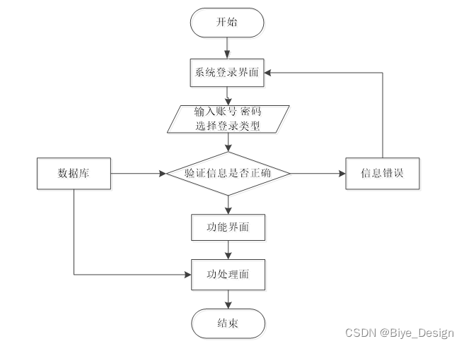 用户想进入系统,首先进入系统登录界面,通过正确的用户名、密码,选择登录类型登录,系统会检查登录信息,信息正确,然后输入相应的功能界面,提示信息错误,登录失败。系统操作流程如图3-4所示。