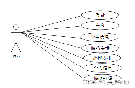 校医用户可以实现主页、个人资料(个人信息、修改密码)、学生信息、服药安排、放假安排等功能模块。