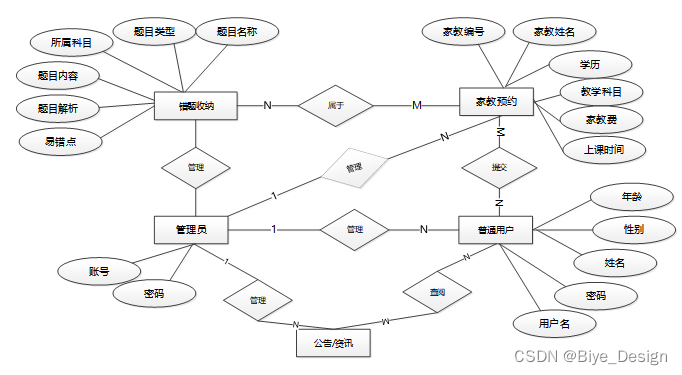 通过家教服务管理系统的功能进行规划分成几个实体信息,实体信息将通过ER图进行说明,本系统的主要实体图如下:
