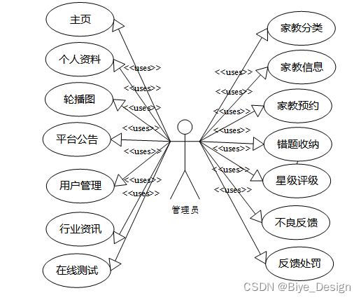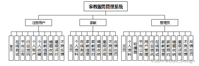 (1)功能要求:主页,个人资料,公告管理(轮播图,平台公告),用户管理(管理员,注册用户,家教),信息管理(行业资讯,资讯分类,在线测试),家教分类,家教信息,家教预约,错题收纳,星级评级,不良反馈,反馈处罚等功能模块。