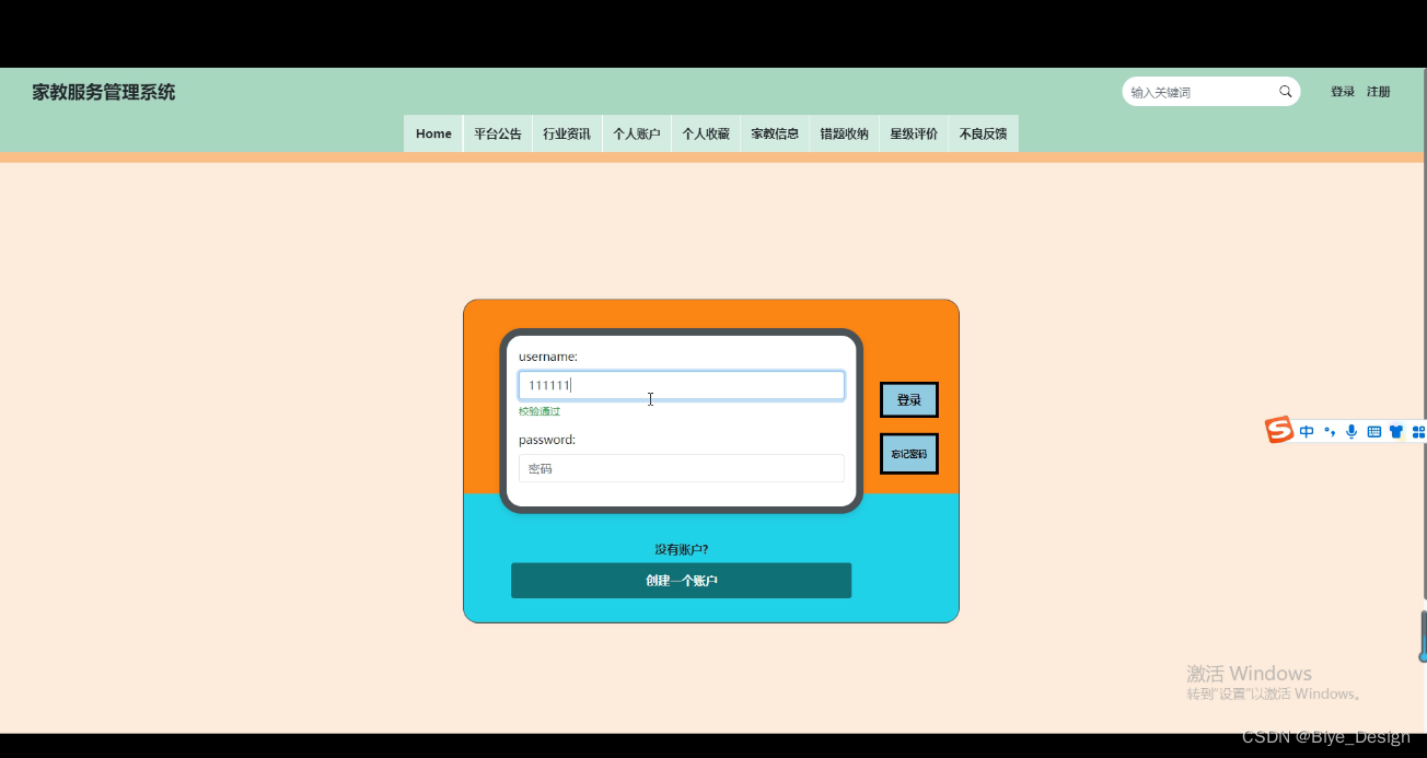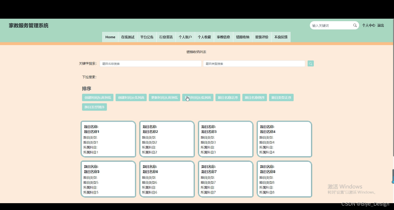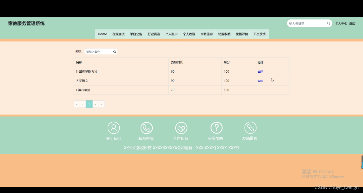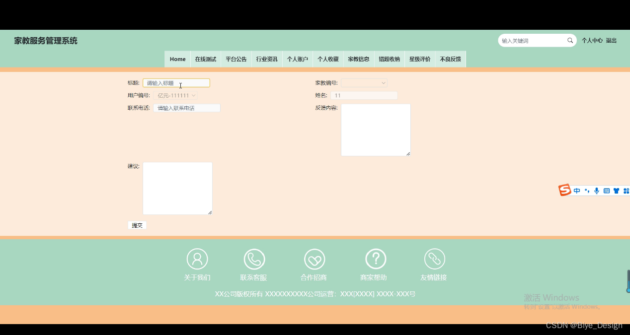 注册用户登录家教服务管理系统,功能为:首页,在线测试,平台公告,行业资讯,个人账户,个人收藏,家教信息,错题收纳,星级评价,不良反馈等功能,如下图所示:
