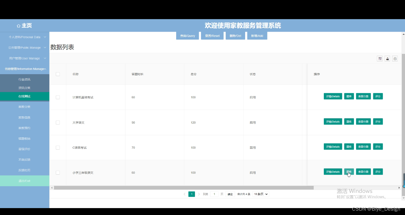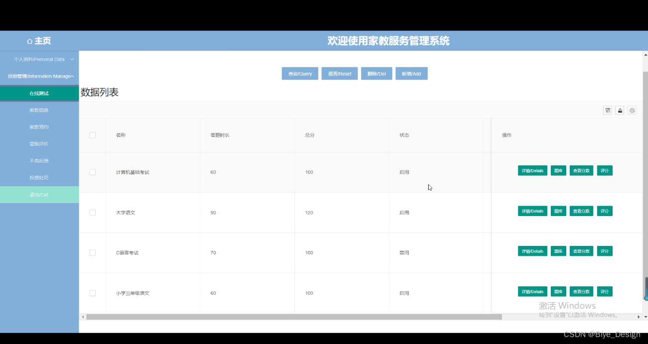 在线测试,在此界面可维护管理在线测试考卷,还可在此页面对进行重置,删除,添加,设计题库,评分等操作,如下图所示: