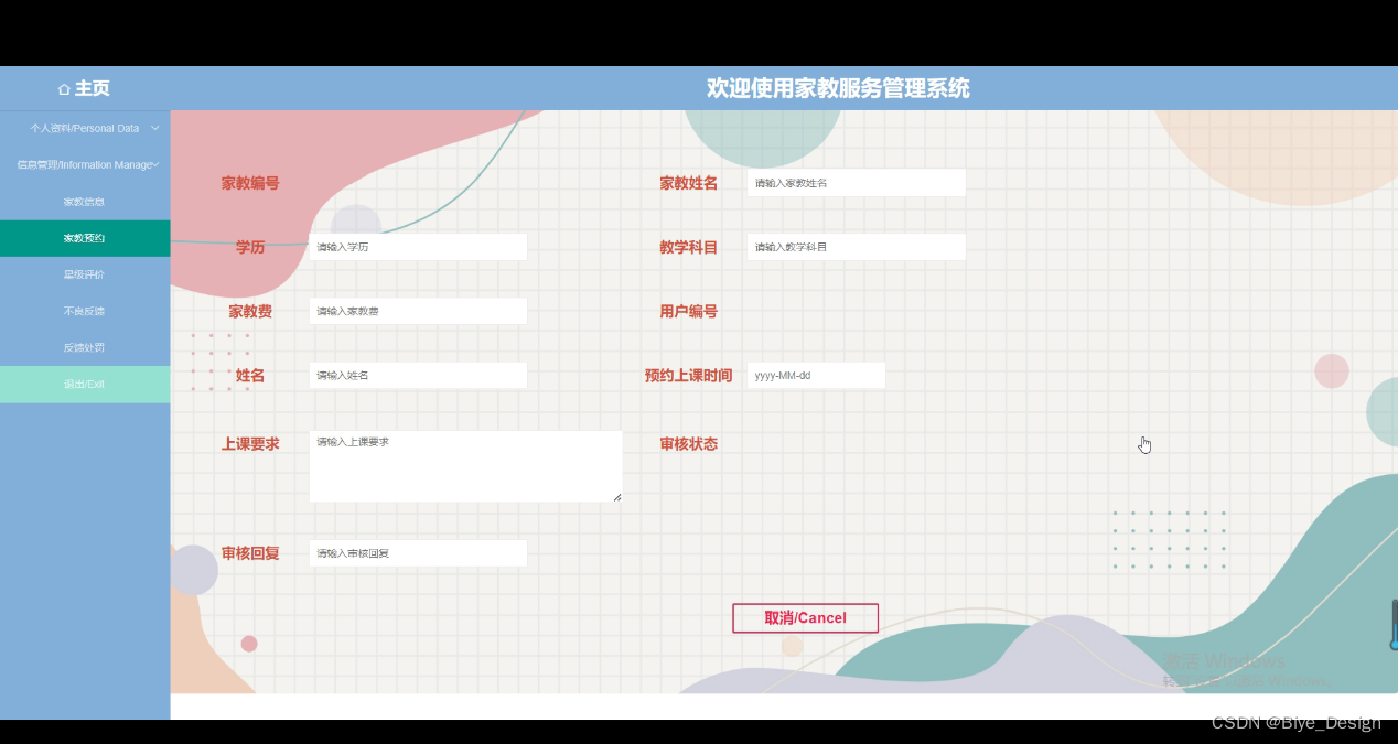 关键词:家教服务管理系统,Java,SpringBoot,Mysql