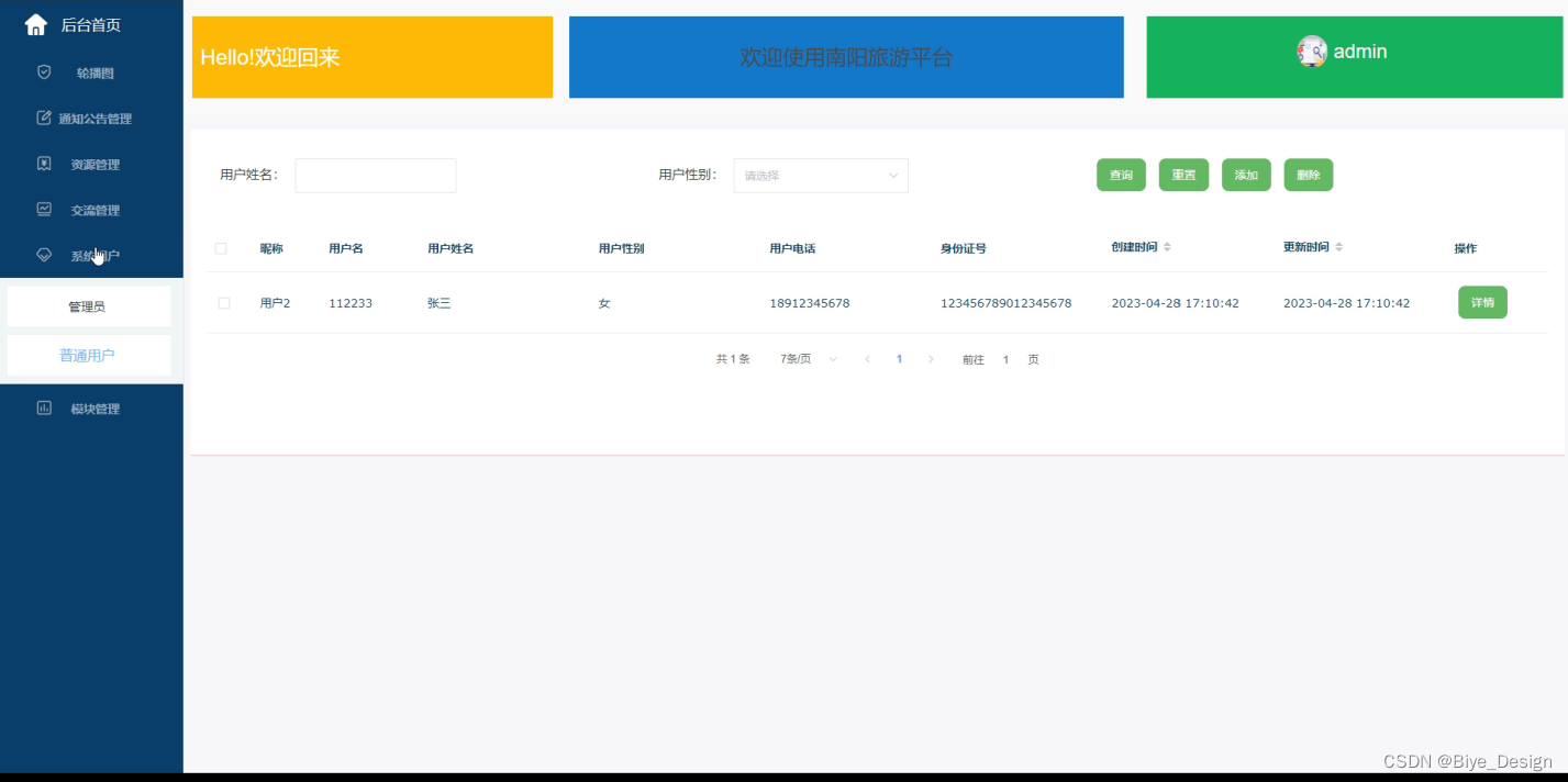 (2)系统用户管理:管理员可以对南阳旅游平台中的管理员及普通用户进行增删改查。