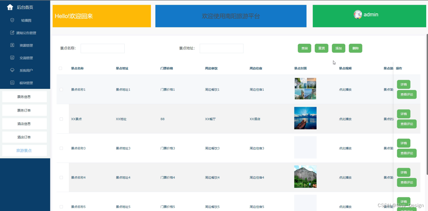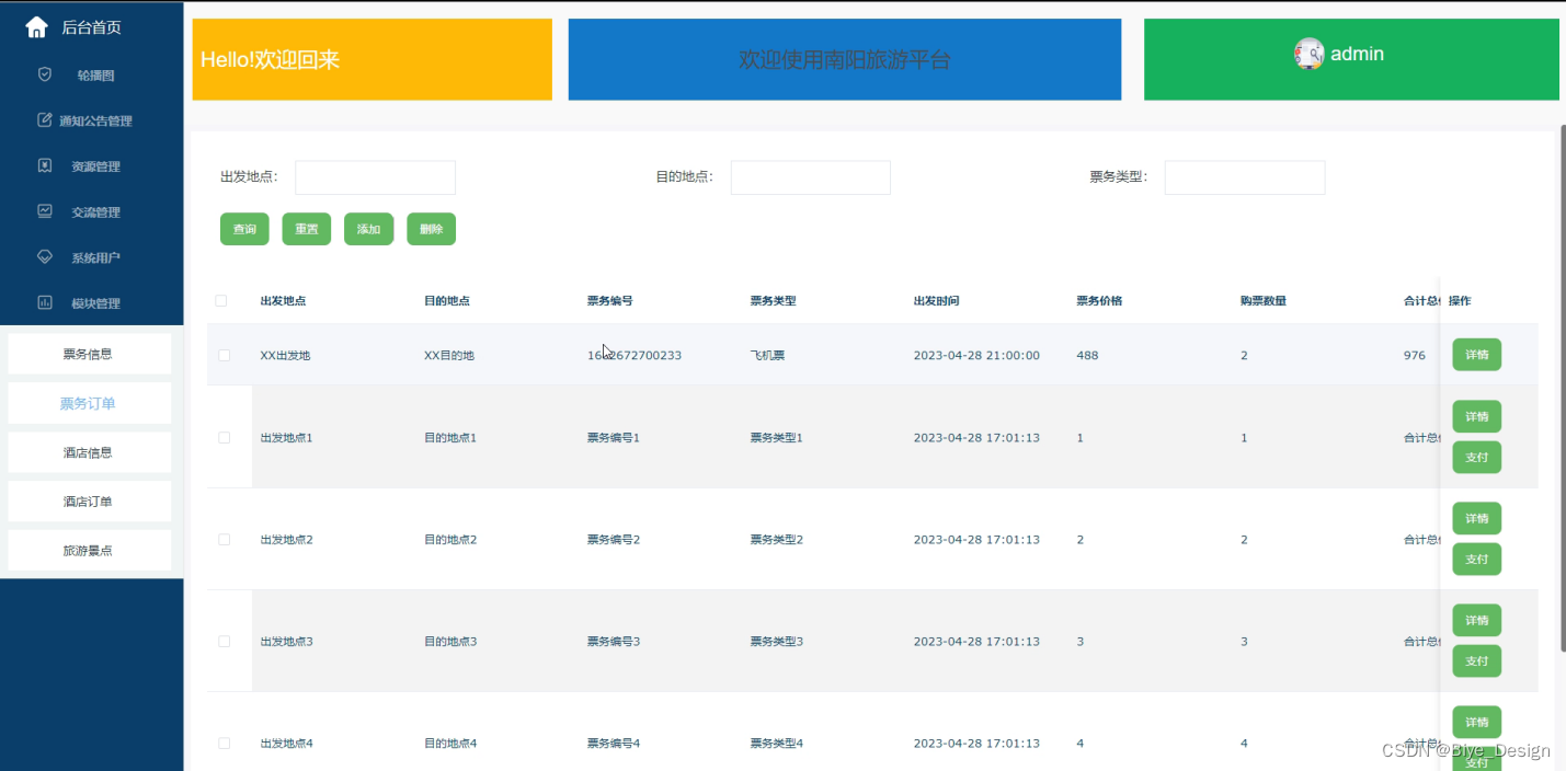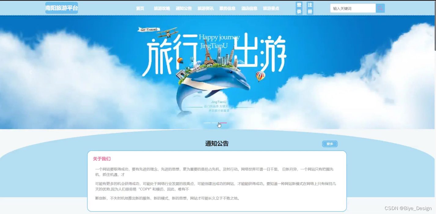 The main functional modules of the Nanyang Tourism Platform include homepage, tourism strategy, notification announcements, ticketing information, hotel information, tourist attractions, backend management (ticketing orders and hotel orders), etc. The object-oriented development model is adopted for software development and hardware installation, which can well meet the actual needs of use and improve the corresponding software installation and program coding work, The system adopts MySQL as the main storage unit for backend data, applies software engineering principles and development methods, and uses Springboot technology to build a management system, achieving all the functions of the system