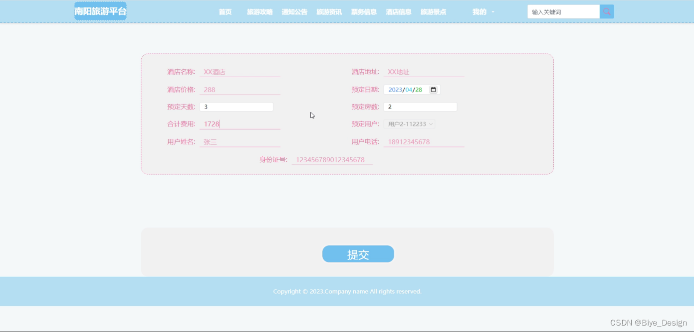 当用户点击的“酒店信息”链接后就进入酒店信息的界面展示,点击酒店可以了解酒店的名称、联系方式、地址、价格等详细信息,用户可以点赞、收藏。点击预定填写相关信息。系统会计算出总价格,点击“提交”按钮进行提交预订。预订界面如下图4-7所示。