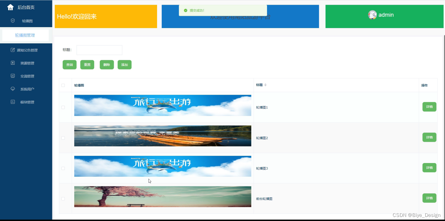- 轮播图与通知公告管理:管理员可以对系统前台展示的轮播图以及公告进行增删改查,方便用户进行查看。