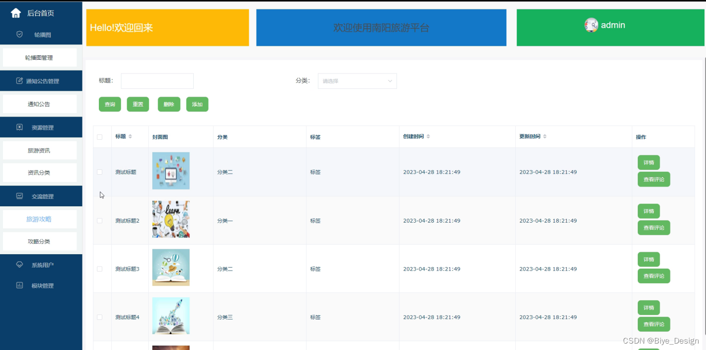 (4)交流管理:管理员可以对旅游攻略及攻略分类进行增删改查等操作。