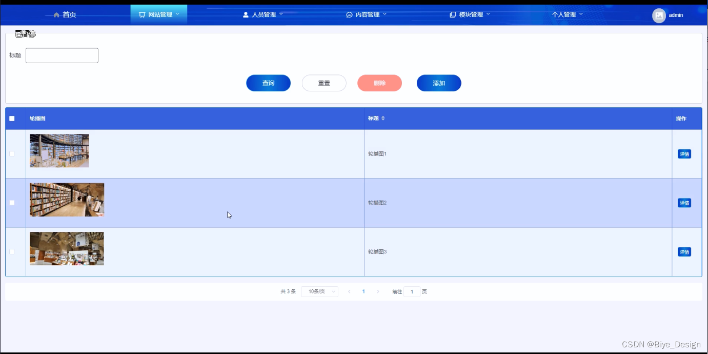 此功能为管理员的功能,管理员点击“物资管理”菜单后,会展示出轮播图、通知公告两个子菜单,任何可以对其进行增删改查操作;其界面展示如下图5-8所示。