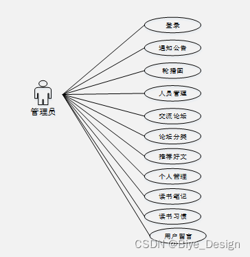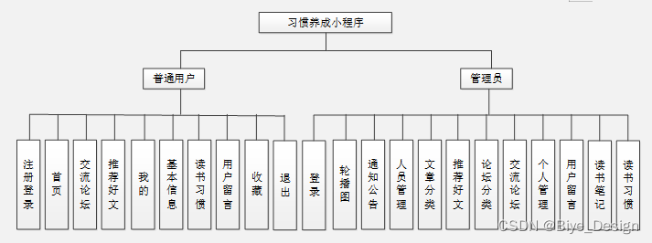 习惯养成小程序基于现有的手机,可以实现管理员,首页、人员管理、好文推荐、通知公告、轮播图、读书习惯、读书笔记、用户留言、个人管理等详细的了解及统计分析。根据系统功能需求建立的模块关系图如下图: