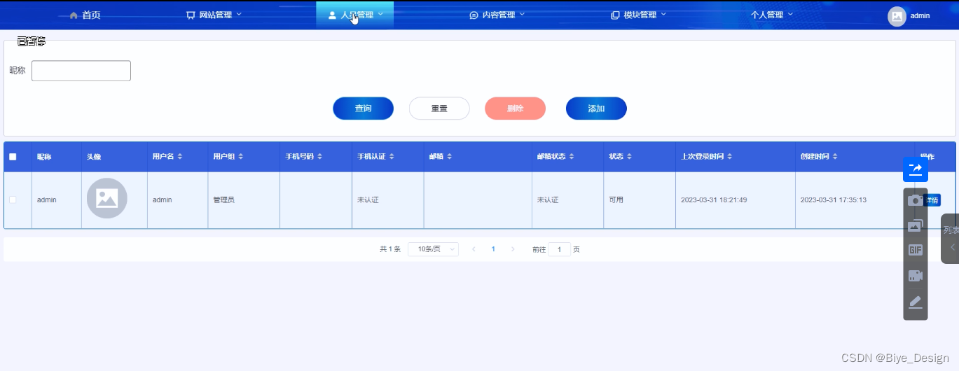 此功能为管理员的功能,管理员点击“人员管理”菜单后,会展示出管理员+普通用户两个子菜单,任何可以对其进行增删改查操作;其界面展示如下图5-9所示。