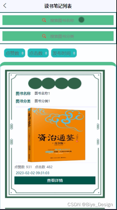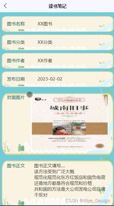 点击任意一个读书笔记后将可以进入到该笔记的详情界面中,它包括了图书名称+图书分类+图书作者+发布日期+封面图片+图书正文等一系列的详细介绍,还可以定位房源的信息,进行预约、一键点赞、收藏、评论等,读书笔记详情界面如下图5-6所示。
