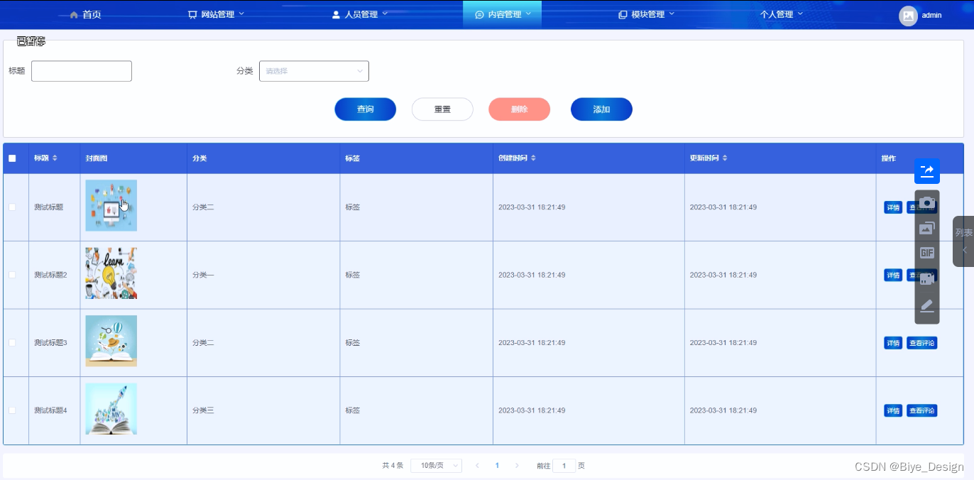 此功能为管理员的功能,管理员点击“内容管理”菜单后,会展示出交流论坛+论坛分类+好书推荐+文章分类四个子菜单,任何可以对其进行增删改查操作;其界面展示如下图5-10所示。