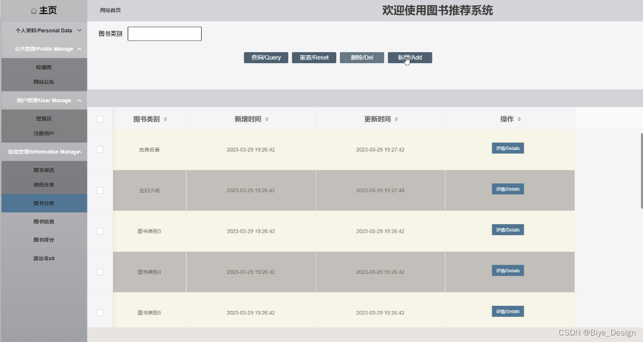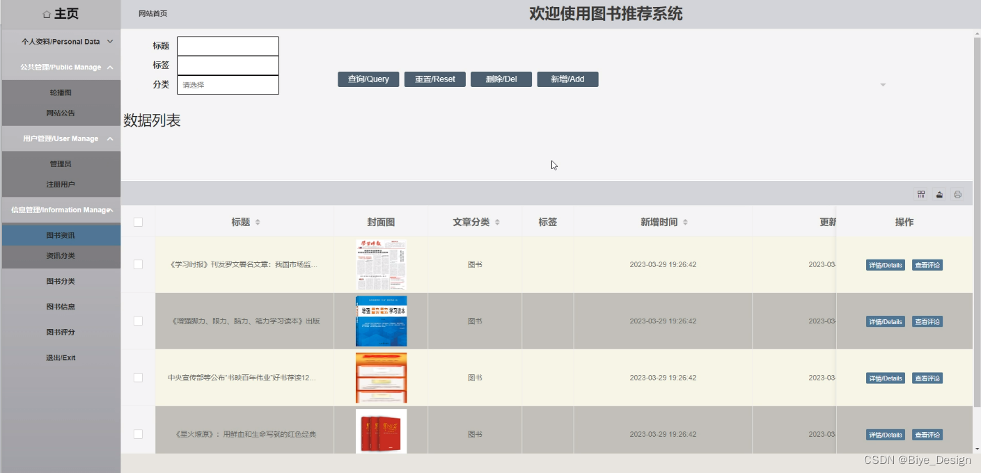 图书信息模块:可分为图书资讯、资讯分类两个模块,管理员对图书资讯有维护的权限,发布新的图书资讯、更新已有的资讯信息数据等。